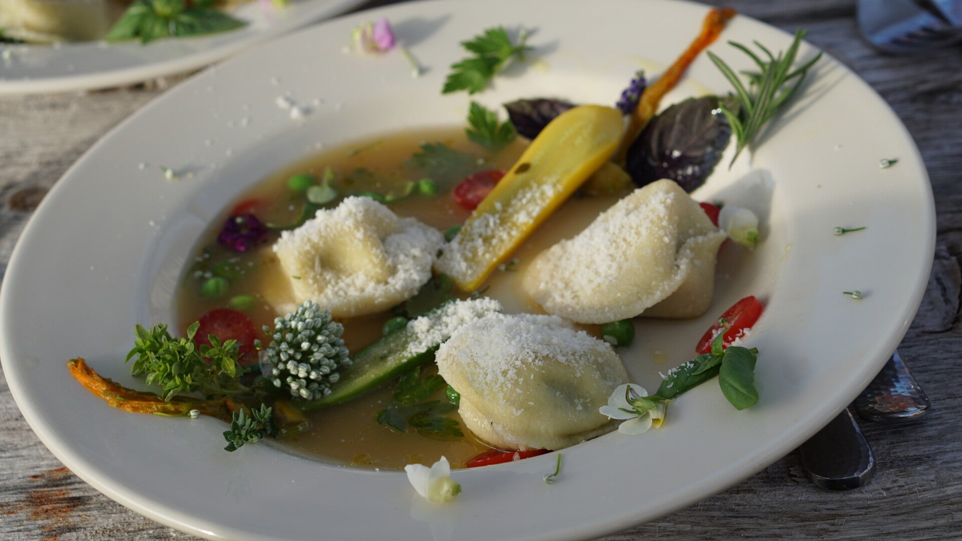 Tortellini en brodo with baby vegetables and flowers